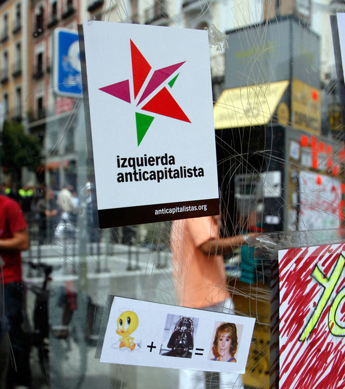 Dos pegatinas, una de Izquierda Anticapitalista y otra de Esperanza Aguirre quien, según parece, es la suma de Piolín y Darth Vader. Como puede verse, son apolíticos.