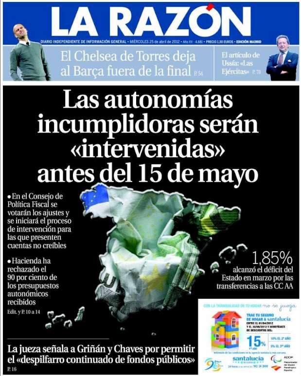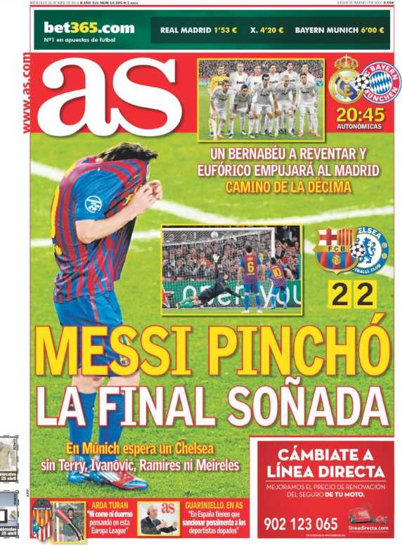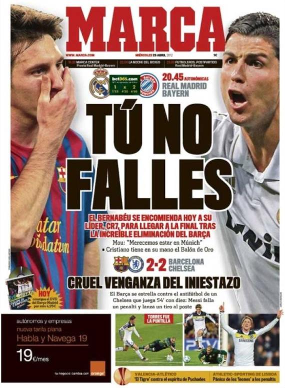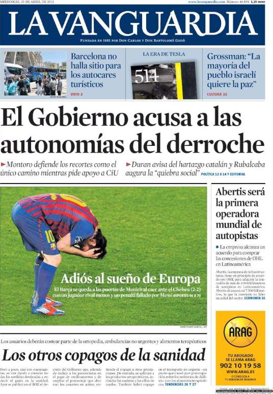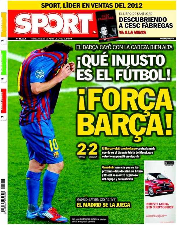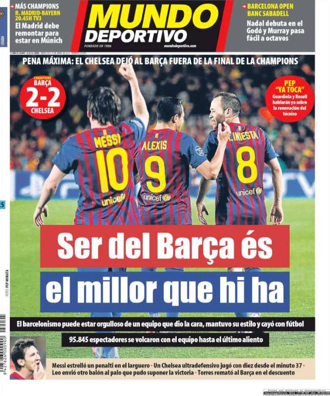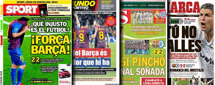 Los diarios deportivos y de información general recogen en sus portadas la eliminación del Barcelona en semifinales de la Liga de Campeones a manos del Chelsea.