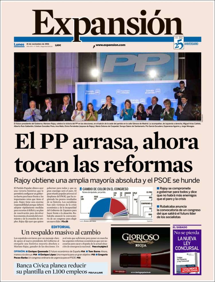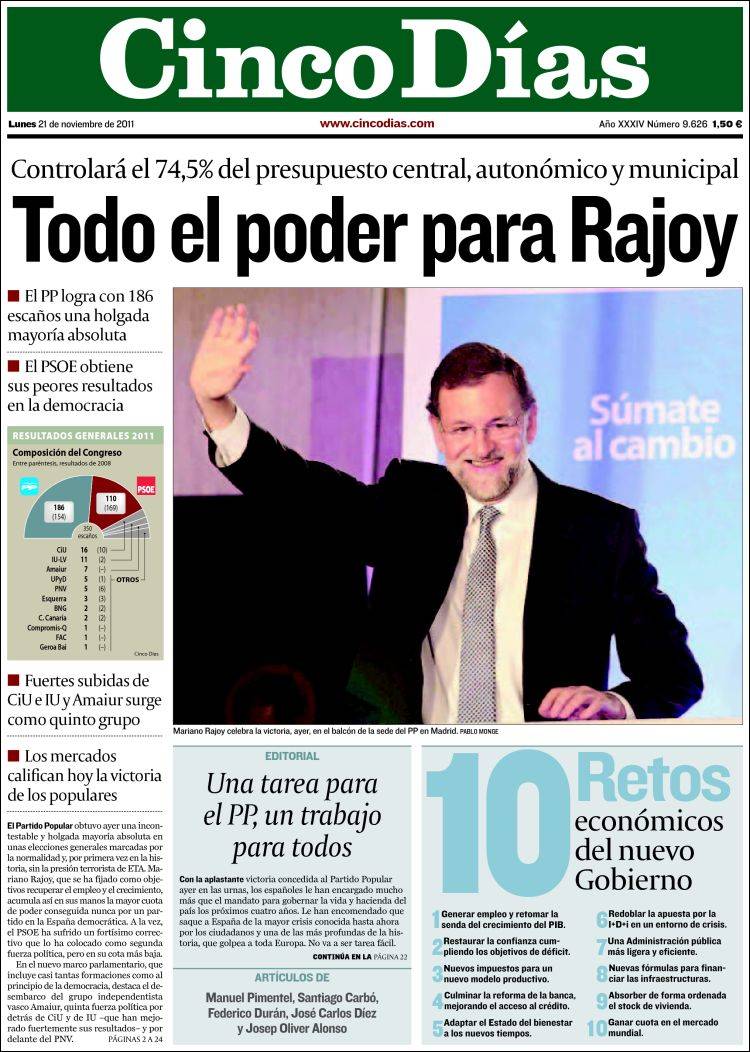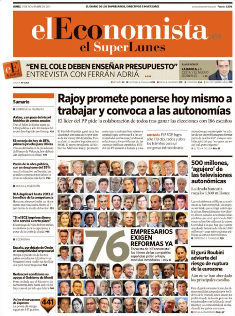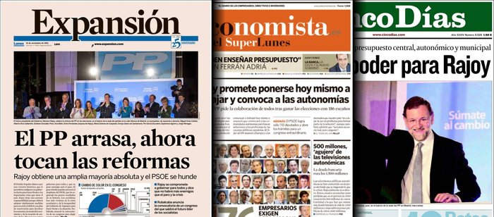 Portadas de los periódicos económicos de este lunes 21 de noviembre de 2011, tras la victoria de Mariano Rajoy en las generales
