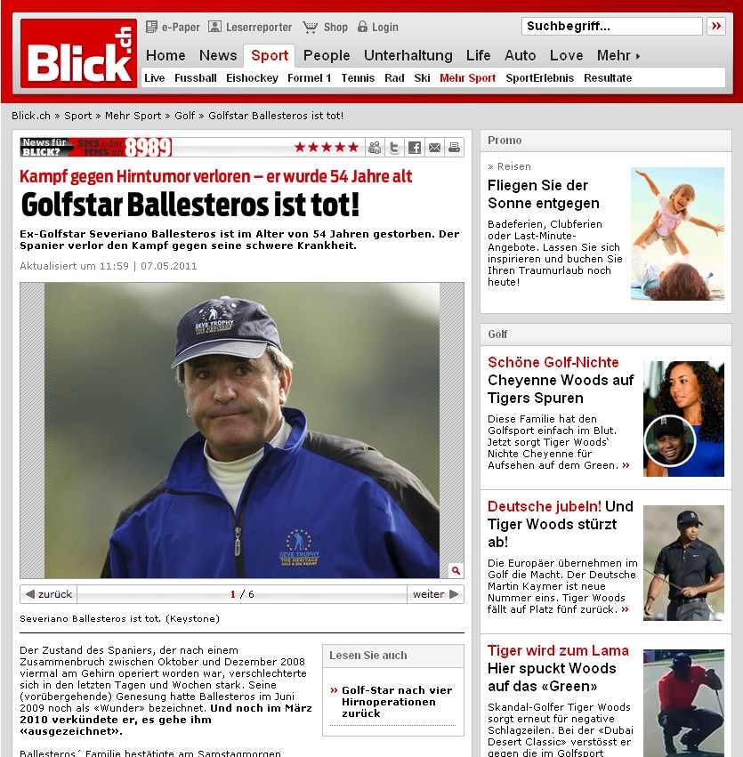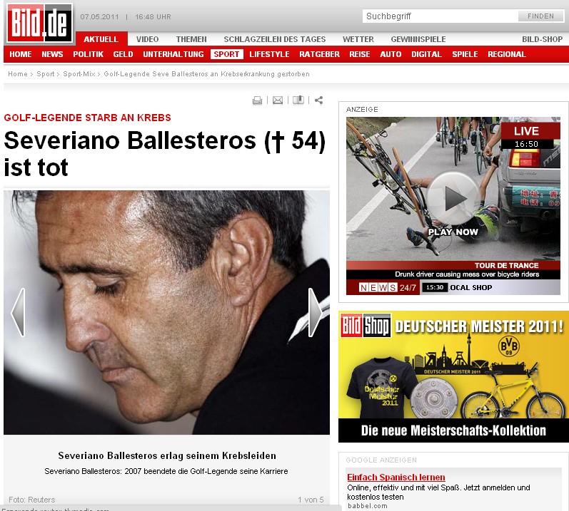 El Bild alemán recogía la muerte del golfista como la primera noticia de su sección de deportes, galería de imágenes incluida.