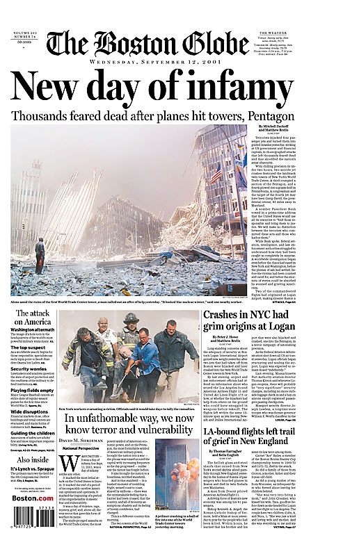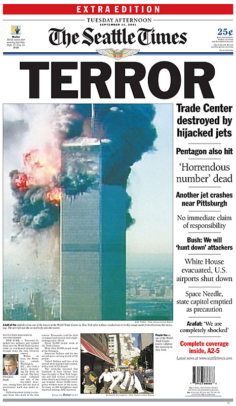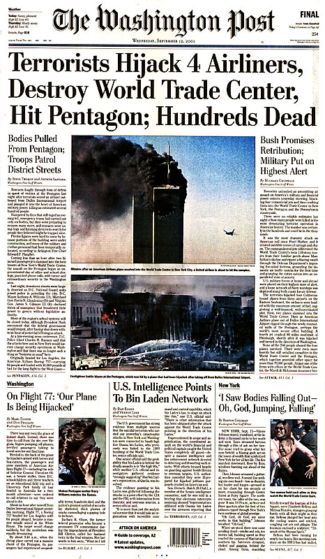 El diario de la capital de EEUU utilizó un titular que recogía buena parte de lo que ocurrió aquel 11-S: "Terroristas secuestran cuatro aviones, destruyen el World Trade Center, golpean al Pentágono, mueren cientos de personas".