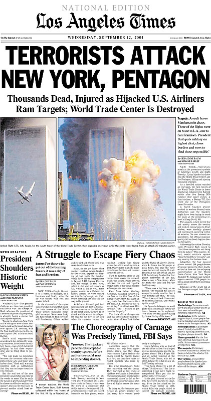El diario de Los Angeles tituló: "Ataque terrorista en Nueva York, Pentágono"