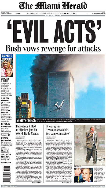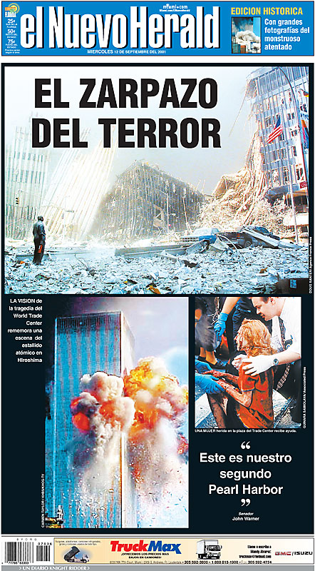 El diario de Florida habló de "actos de maldad" y eligió la imagen del segundo avión impactando contras las torres.
