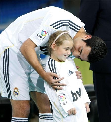 Una pequeña aficionada del Real Madrid, vestida con la camiseta de Albiol, quien le hace un gesto cariñoso. (EFE)