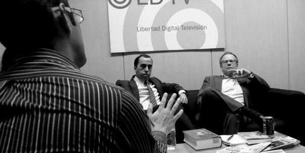 Mario Noya, director del programa, en la sala de invitados con José Maria Marco y Víctor Gago.