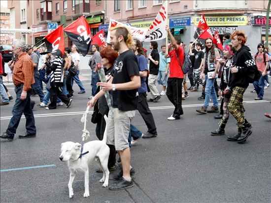 Asistentes a la manifestación celebrada en Madrid,convocada por el sindicato CNT , con motivo del Día del Trabajo , a su paso por la calle Bravo Murillo.
