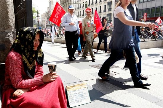 Una joven indigente pide limosna a la puerta de una iglesia, mientras discurre la manifestación conjunta de CCOO y UGT en Madrid con motivo del Día del Trabajo que, bajo el lema "Por el empleo con derechos y la garantía de nuestras pensiones", transcurrrió entre Cibeles y la Puerta del Sol.