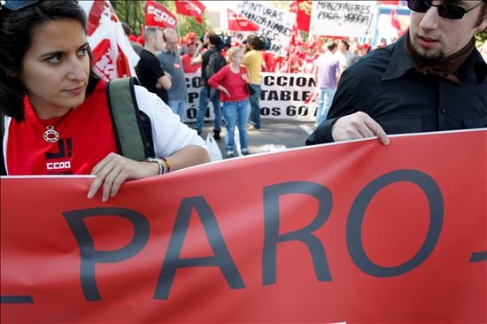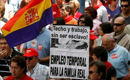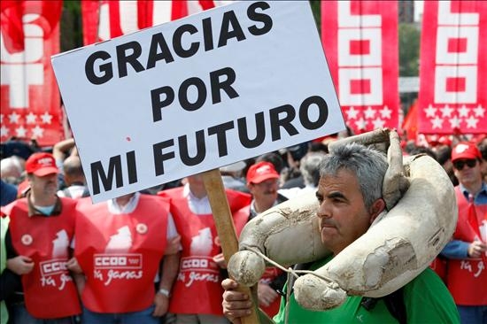 Imagen de una de las pancartas durante el acto central en Madrid de CCOO y UGT, celebrado con motivo del 1 de mayo, jornada en la que se celebra el Día Internacional del Trabajo, en el que el empleo, las pensiones, la protección social y la reforma del sistema financiero centraron las reivindicaciones.