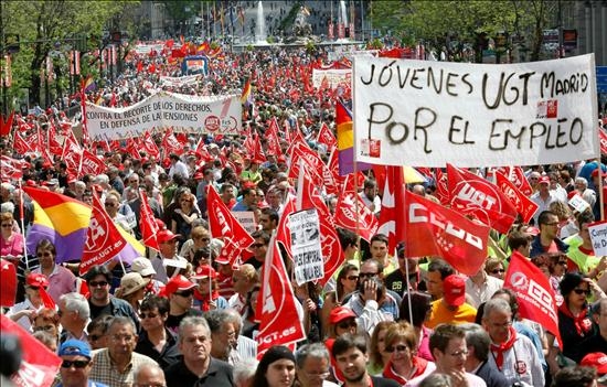 Vista general de la manifestación conjunta de CCOO y UGT en Madrid con motivo del Día del Trabajo que, bajo el lema "Por el empleo con derechos y la garantía de nuestras pensiones", transcurrrió entre Cibeles y la Puerta del Sol. En la manifestación pudieron verse numerosas banderas republicanas.