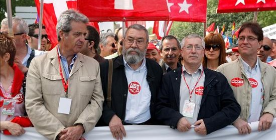 El secretario general de UGT-Madrid, José Ricardo Martínez (i), el secretario general de UGT, Cándido Méndez (2i), el secretario general de CCOO, Ignacio Fernández Toxo (2d), y el secretario general de CCOO de Madrid, Javier López (d), en la cabecera de la manifestación, durante el acto central en Madrid de CCOO y UGT. Los sindicatos aprovecharían la ocasión para mostrar su apoyo al juez Garzón.