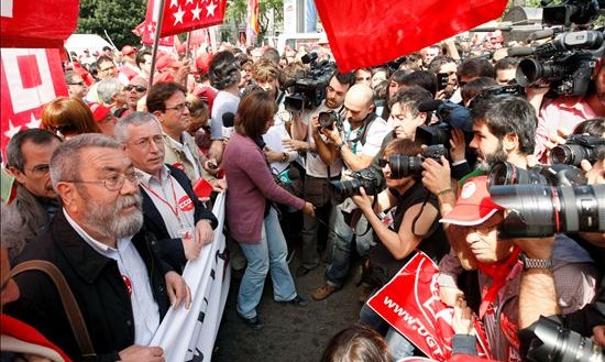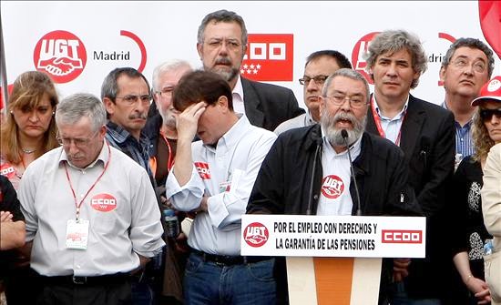 El secretario general de UGT, Cándido Méndez (d), junto al secretario general de CCOO, Ignacio Fernández Toxo (i), durante su discurso en la manifestación conjunta de CCOO y UGT en Madrid con motivo del Día del Trabajo que, bajo el lema "Por el empleo con derechos y la garantía de nuestras pensiones". Méndez cargó contra Alemania, el PP y Franco.