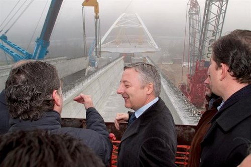 El ministro de Fomento está de gira por Galicia el día de la marcha contra la negociación con ETA. En la foto, ante las obras de construcción del nuevo puente sobre el río Miño durante el mismo día. EFE/Eliseo Trigo