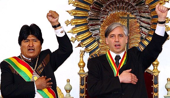 Evo Morales y su vicepresidente cantan con el puño en alto y la banda presidencial.