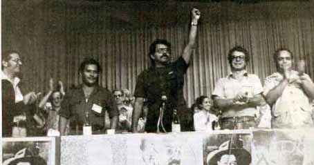 Daniel Ortega levanta el puño en señal de victoria en 1979.