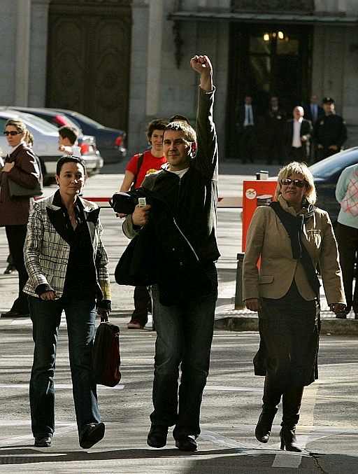 Arnaldo Otegui levanta el puño junto a Jone Goirizelaia, abogada y ex parlamentaria de HB, saliendo de la Audiencia Nacional.