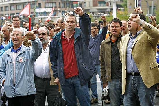 Los dirigentes batasunos Joseba Permach y Pernando Barrena levantan el puño durante una manifestación.