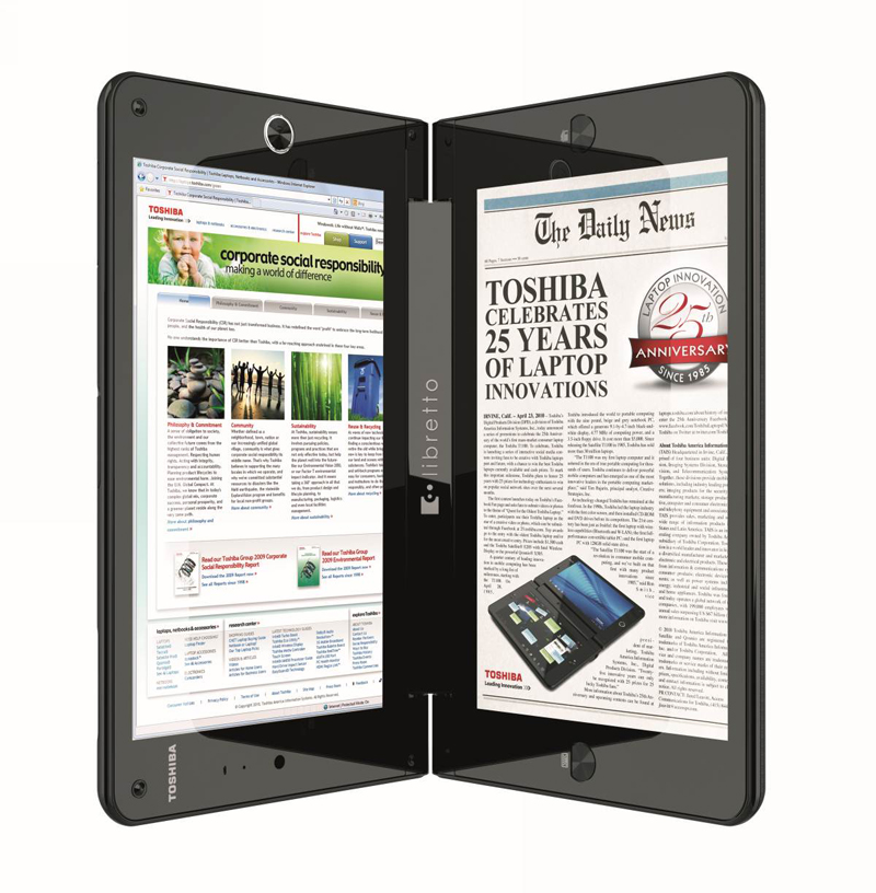 25 años después de lanzar su primer portátil, Toshiba saca al mercado el Libretto W100, un ultraportátil con dos pantallas táctiles de 7 pulgadas a las que podemos darles diferentes usos: como ebook, teclado QWERTY.