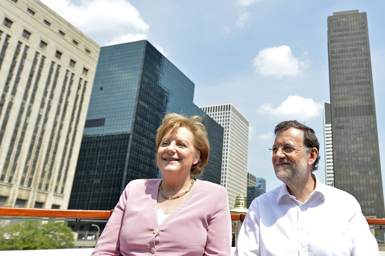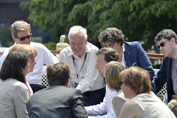 Imagen de las delegaciones española y alemana. Rajoy habla y el resto escuchan.