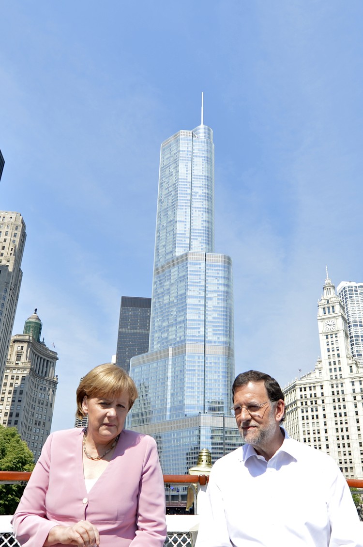 El presidente con la canciller alemán, muy relajados, disfrutando de las vistas del río Chicago.