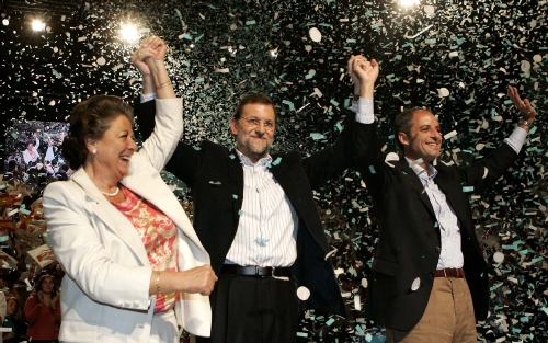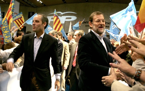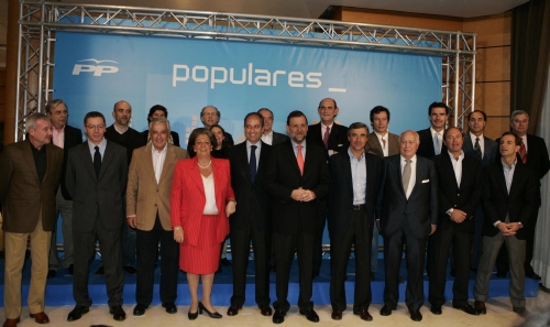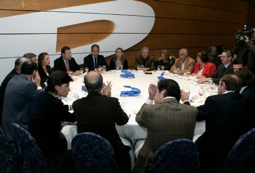 Mariano Rajoy acompañado en la cena previa de este viernes por el presidente del PP de la Comunidad Valenciana, Francisco Camps, por la alcaldesa de Valencia, Rita Barberá, el secretario general, Ángel Acebes, el director de la campaña del PP, Pío García Escudero, el coordinador del programa, Juan Costa, el responsable de Justicia, Seguridad y Libertades Públicas de los populares, Ignacio Astarloa, y el alcalde de Madrid, Alberto Ruiz Gallardón, entre otros.
