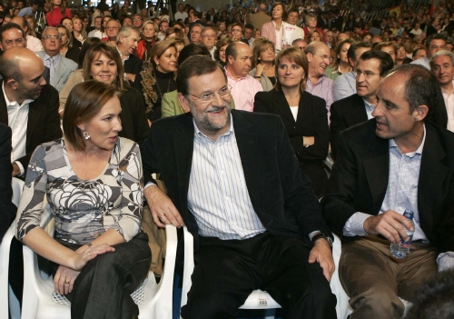 Rajoy sentado al lado de Camps. Parte de los asistentes, que comenzaron a llenar las gradas desde más de una hora antes del comienzo de las intervenciones, acudieron al recinto ferial en los doscientos autobuses que facilitó la organización, y su espera fue amenizada por vídeos musicales.