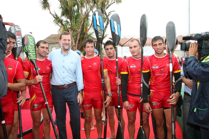 El líder del PP, que presenció una regata de piraguas, se fotografió con la selección española de piragüismo. (PP)