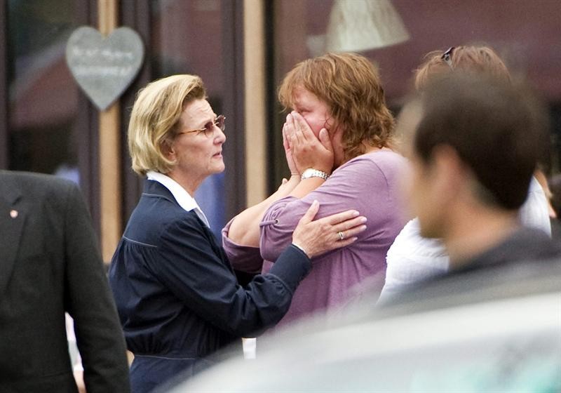 La reina Sonja de Noruega (i), consuela a los familiares de las víctimas del tiroteo en la isla de Utoya, en un campamento juvenil, durante la concentración de los parientes en un hotel de Sunvold. Efe