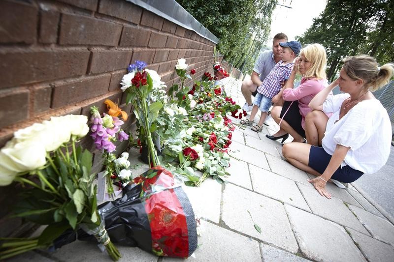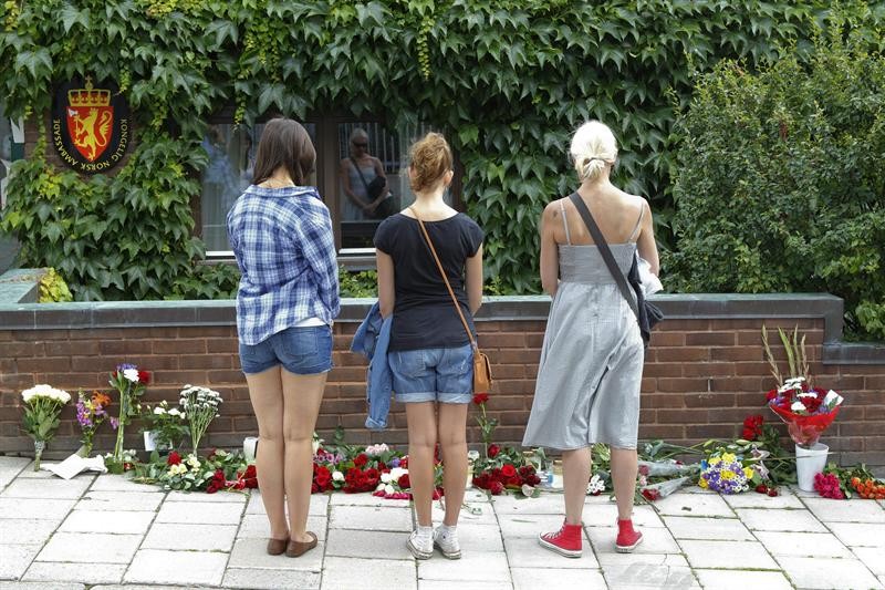 Varias personas contemplan las flores depositadas en homenaje a las víctimas del 22 de julio en el exterior de la Embajada de Noruega, en Estocolmo, Suecia.