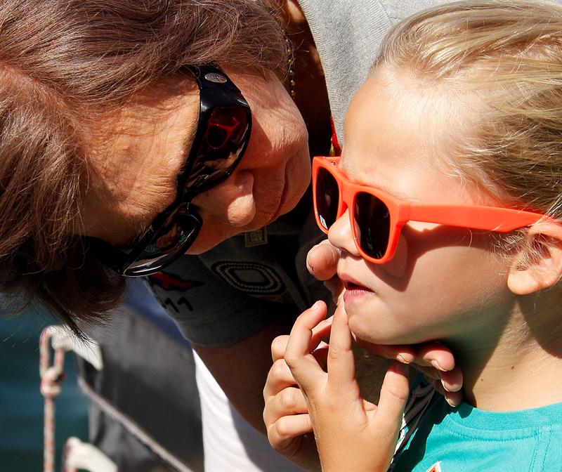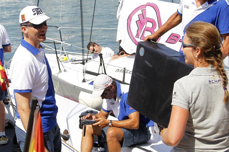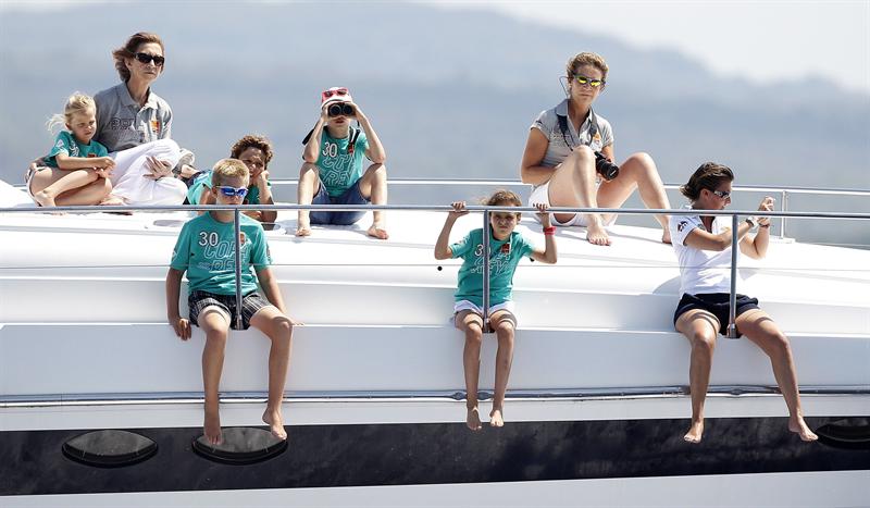 La Reina junto a su hija la Infanta Elena y sus nietos Irene, Juan Valentín, Froilán, Pablo Nicolás y Victoria Federica, esta mañana a bordo de la lancha 'Somni' al inicio de la primera jornada de la 30ª edición de la Copa del Rey de Vela. EFE