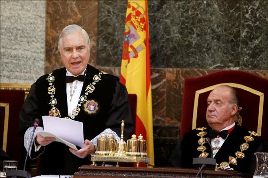 El rey Juan Carlos, junto al presidente del Consejo General del Poder Judicial, Carlos Dívar (izda), durante el solemne acto de apertura de los tribunales que da inicio al nuevo año judicial