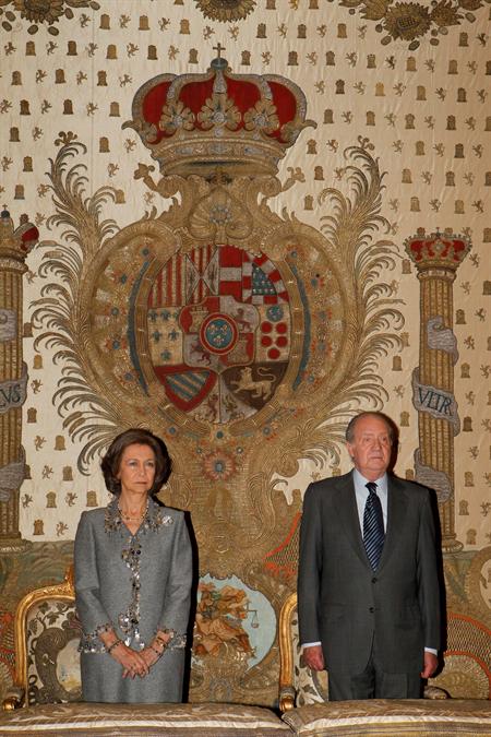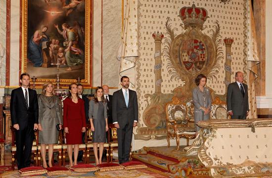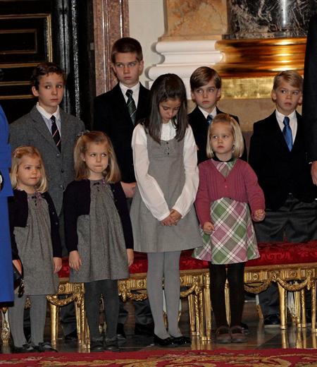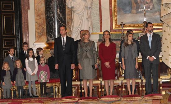 La Familia Real durante la ceremonia religiosa oficiada en la capilla del Palacio Real con motivo del centenario del nacimiento de doña María de las Mercedes de Borbón y Orleans.