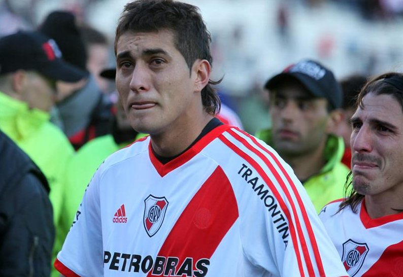 Roberto Pereyra (i) y Carlos Arano (d) lloran tras consumarse el descenso de River.