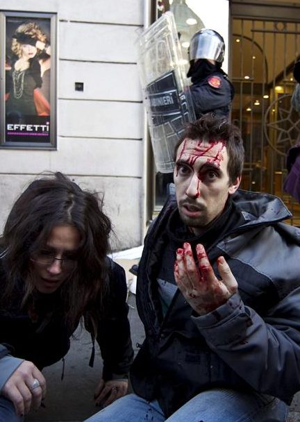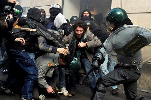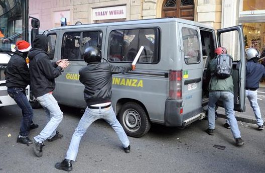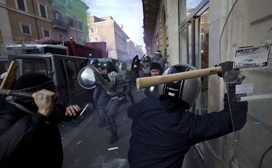 La policía trata de responder a los anti sistema atabiados con bates de béisbol y cascos de moto.