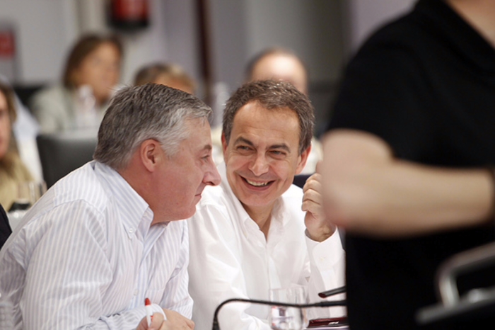 Zapatero y Rubalcaba, presidente y nuevo candidato, dos de las caras que más flashes acapararon en el Comité del PSOE.