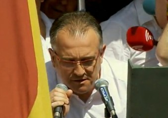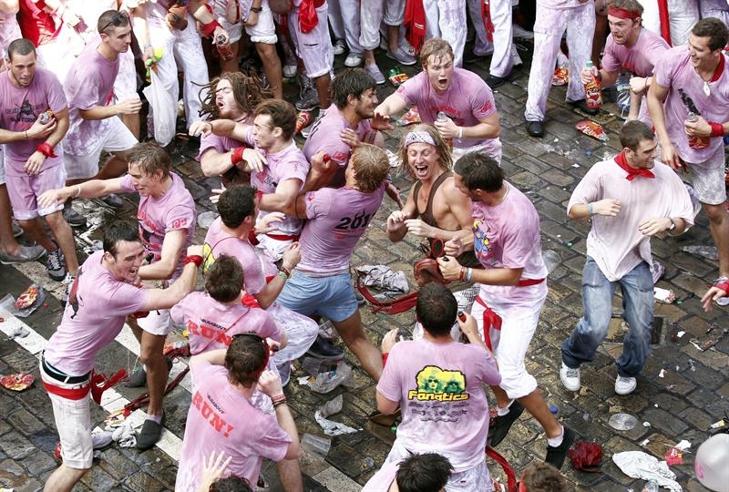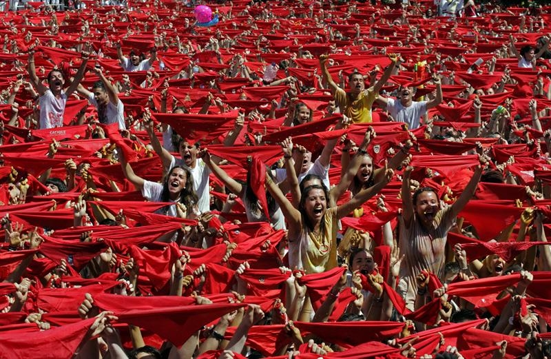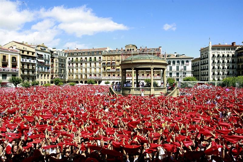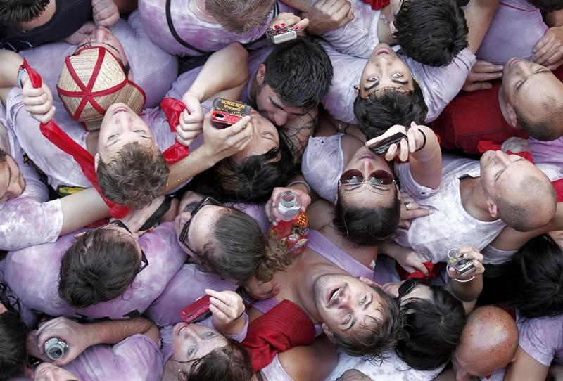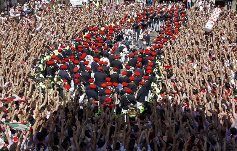 Miles de pamploneses y foráneos se divierten hoy en la Plaza del Ayuntamiento de Pamplona tras el tradicional "Chupinazo", con el que dan comienzo las fiestas de San Fermín 2011.