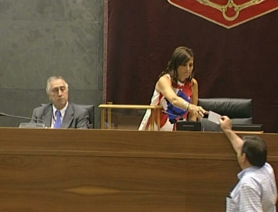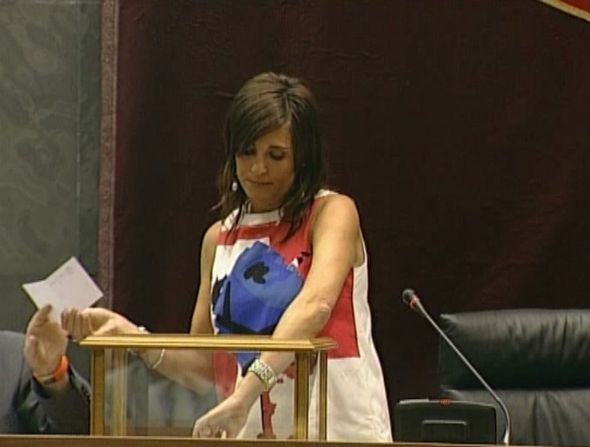 Detalle de la urna de votaciones junto a la presidenta del parlamento navarro, Elena Torres. (LDTV)