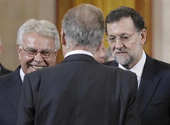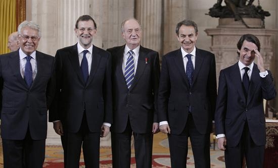 Con Don Juan Carlos de espaldas, el expresidentes Felipe González sonríe distendido mientras que Mariano Rajoy se mantiene serio