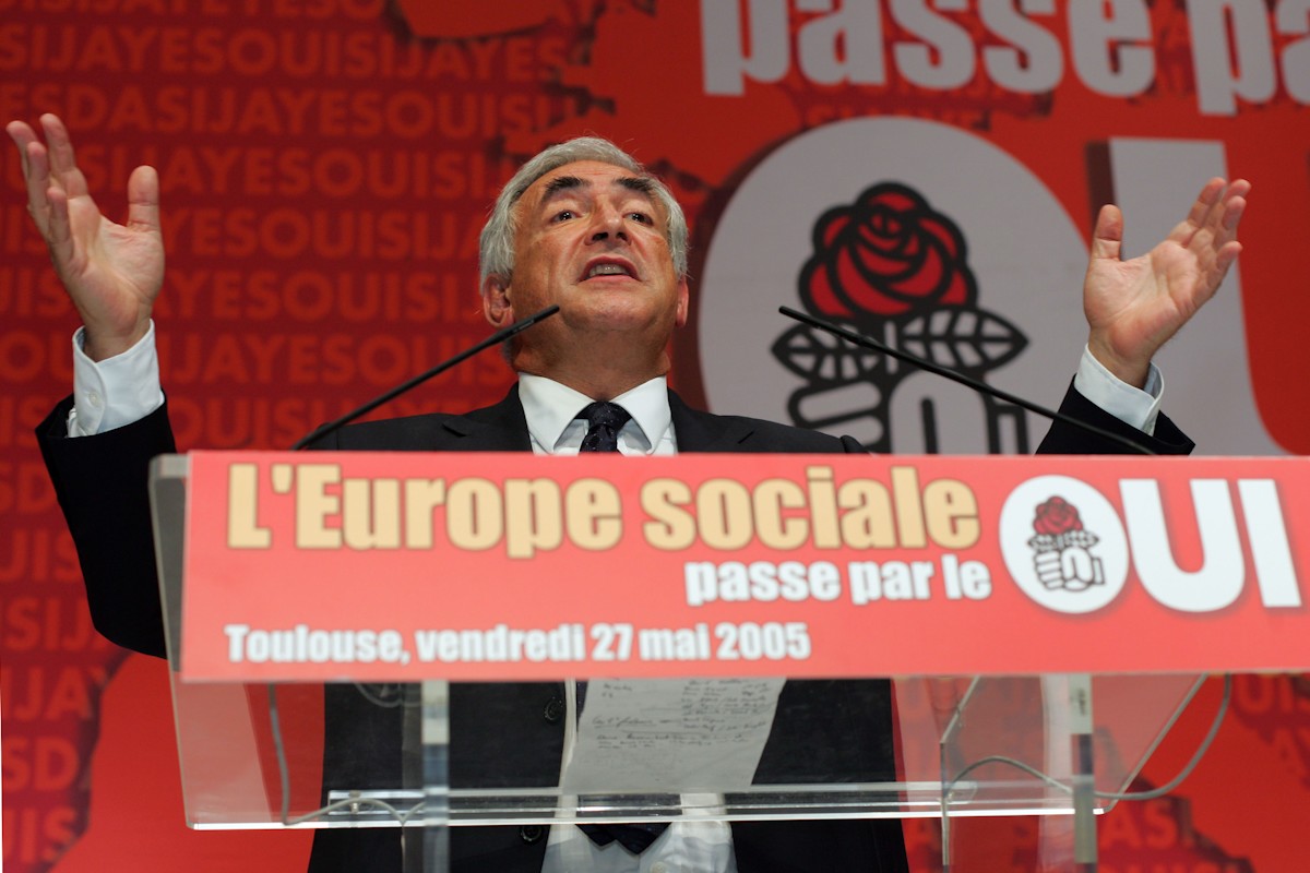 No dejó la política ni el partido. Ejerció de diputado y se convirtió en miembro de la dirección del Partido Socialista en 2004. En 2005, maquinaba ya su candidatura para enfrentarse a Sarkozy. En esta imagen, aparece en un mitin para pedir el sí a la Constitución europea junto a su esposa, Anne Sinclair.