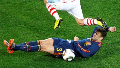 El jugador paraguayo Nelson Valdéz salta sobre el español Gerard Piqué durante el partido Paraguay-España