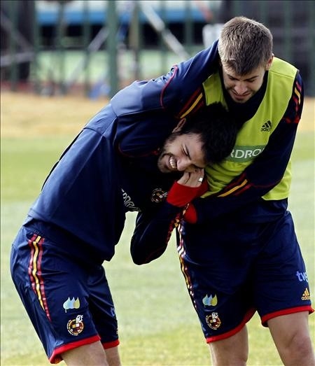 Los jugadores de la selección española Cesc Fábregas y Gerard Piqué bromean durante el entrenamiento realizado ayer en Potchefstroom