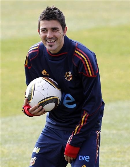 El delantero de la selección española David Villa muy sonriente durante el entrenamiento