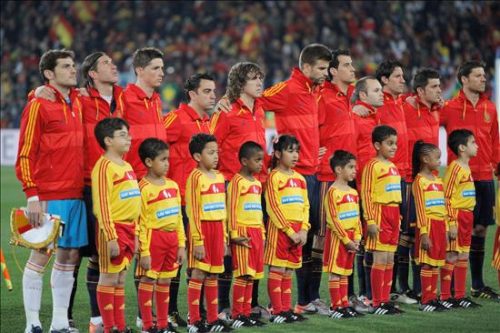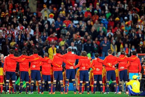 Los jugadores españoles escuchan el himno nacional al inicio del partido de cuartos de final