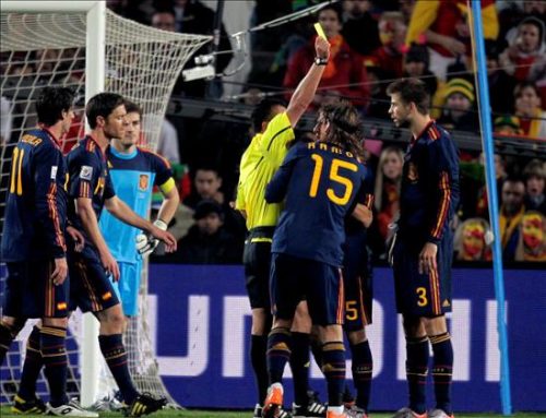 El colegiado guatemalteco Carlos Batres muestra la cartulina amarilla a Gerard Piquéd,d, despues de señalar penalti en contra de la selección española en el partido de los cuartos de final.