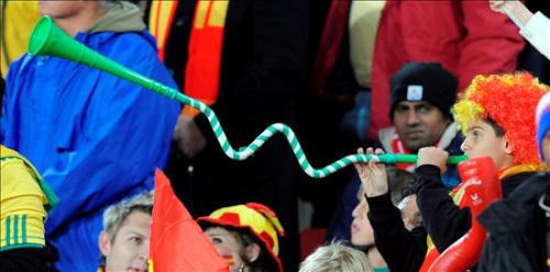 Un aficionado español toca una vuvuzela antes del partido Paraguay-España, de cuartos de final del Mundial de Fútbol de Sudáfrica 2010, en el estadio Ellis Park de Johannesburgo, Sudáfrica.