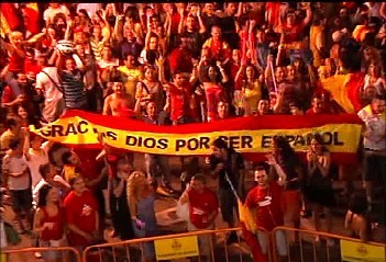 Este grupo de aficionados muestran una pancarta con el lema "Gracias Dios por ser español". (Imagen TV)