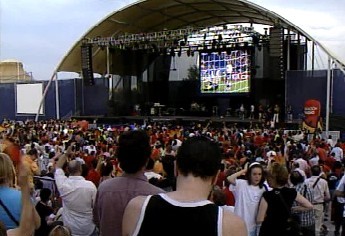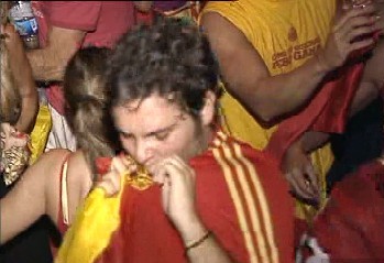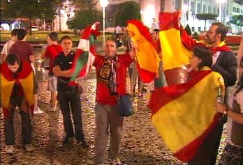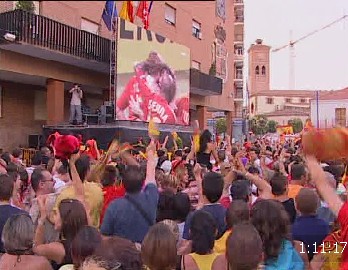 Muy especial fue también la celebración del triunfo en Móstoles, ciudad de Iker Casillas. En la imagen, los mostoleños celebran el gol de Torres. (Imagen TV)
