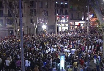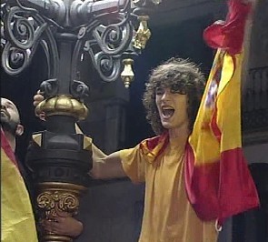 También se celebró en Barcelona. En la imagen, un joven celebra la victoria de la selección encaramado en una farola. (Imagen TV)