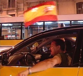 En la Ciudad Condal, un taxi donde ondea la bandera de España. (Imagen TV)