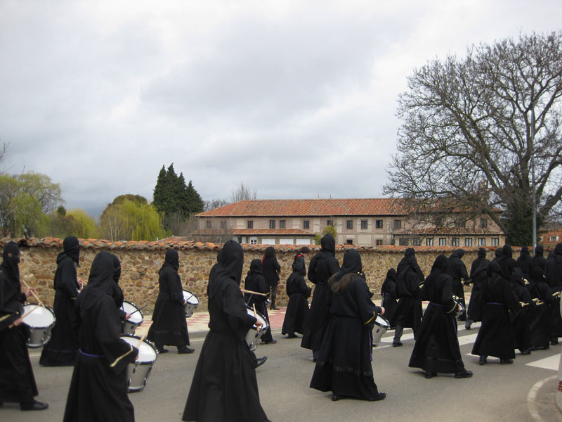 Procesión del Viernes Santo. Banda de tambores y cornetas formada por jóvenes de la comarca. Al fondo el monasterio Santa María de Carrizo. (Familia Fernández)