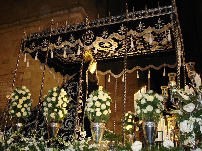 Paso de La Virgen de La Soledad esperando ser procesionada, en la sede de la Hermandad (J.L.Grela)